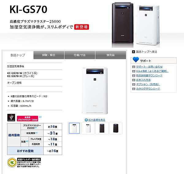 Diện tích thích hợp. Máy Lọc Không Khí Nhật Thiết Bị Theo Mùa Từ khóa. Ki-gs70-h グレー系 タイプ加湿空気清浄機 フィルター種類HEPA 最大適用床面空気清浄31畳 フィルター寿命10年 PM25対応 メーカー製品情報ページ. Máy lọc không khí Sharp KI-LP100. Máy lọc không khí Sharp KI-HS70.